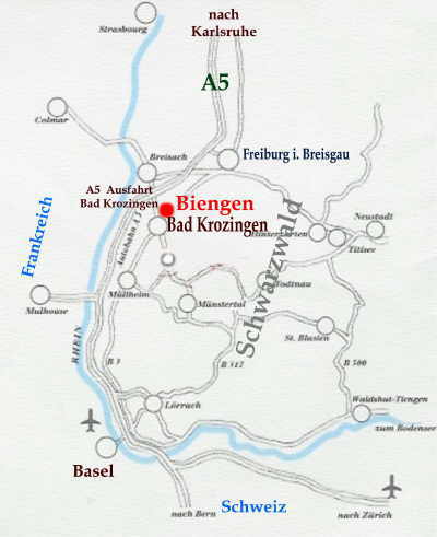 Nehmen Sie die Autobahnausfahrt Bad Krozingen (Richtung Bad Krozingen) nach ca. 2 km links ab in den Ort Biengen. Fahren Sie dort ganz durch den Ort und die letzte Straße rechts (Rebweg). Nach ca. 300 m wieder rechts (nächst mögliche Straße) (In der Breite) nach ca. 50 m rechte Straßenseite “Haus Rosi”